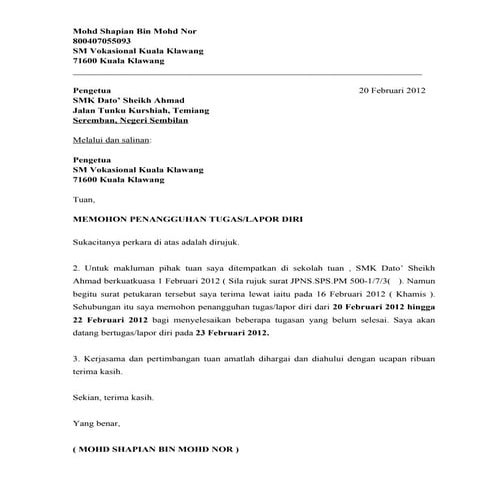 Tuan PEMBERITAHU PERTUKARAN NAMA JAWATAN DAN GRED BILANGAN TAHUN. Untuk memohon penangguhan apa yang perlu anda lakukan ialah. Contoh surat rasmi penangguhan lapor diri surat tangguh tugas pertukaran serv cuitan dokter.
